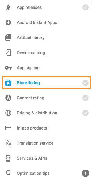 Agora você deve preencher a informação sobre o seu app que será exibida no Google Play. Para o fazer, clique na aba "Presença na loja" no menu do lado esquerdo.Tenha em atenção que apenas a informação obrigatória é mencionada nesta ajuda online, a restante informação é opcional.