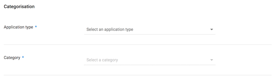 Selecione "Aplicação" no menu suspenso "Tipo de Aplicação". Depois selecione a categoria do seu app, ou seja, o seu tópico principal (i.e., Notícias, Estilo de Vida, Entretenimento,...).
