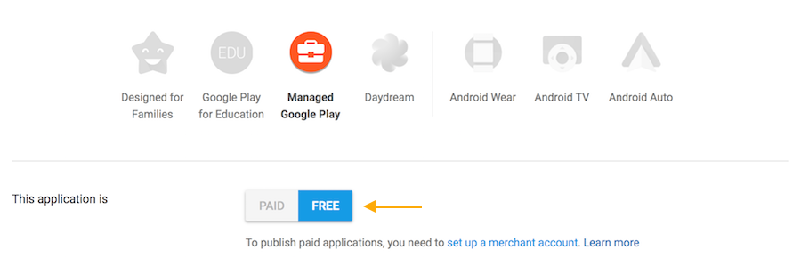 Se pretende distribuir aplicações pagas, você terá que configurar uma conta comerciante. Para o fazer, clique sobre o link que é mostrado na sua consola.