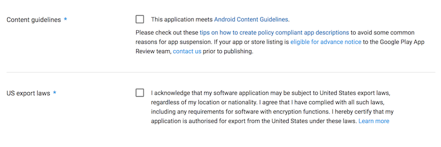 Você deve confirmar que o seu app está em conformidade com as Diretrizes de Conteúdo da Android e reconhecer as leis de exportação dos Estados Unidos. Para o fazer, selecione as duas últimas caixas.