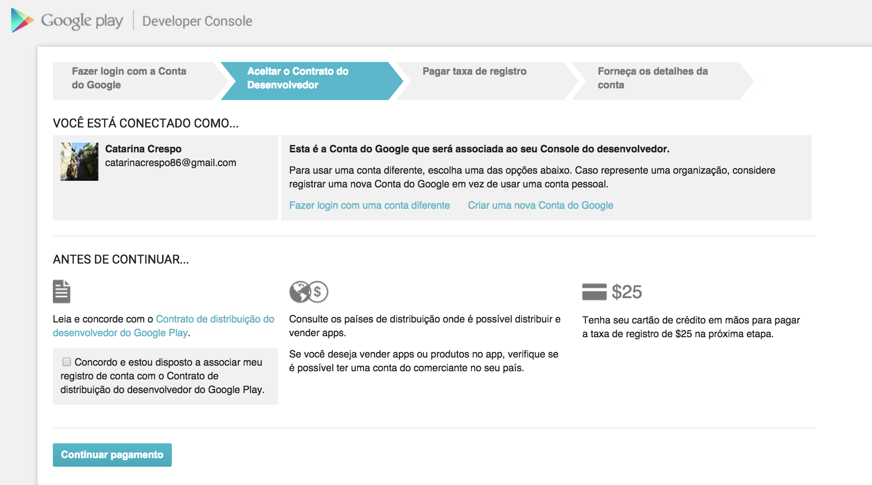 Ao fazer este processo você estará validando o fato de que a sua conta do Google será associada à sua conta de programador.