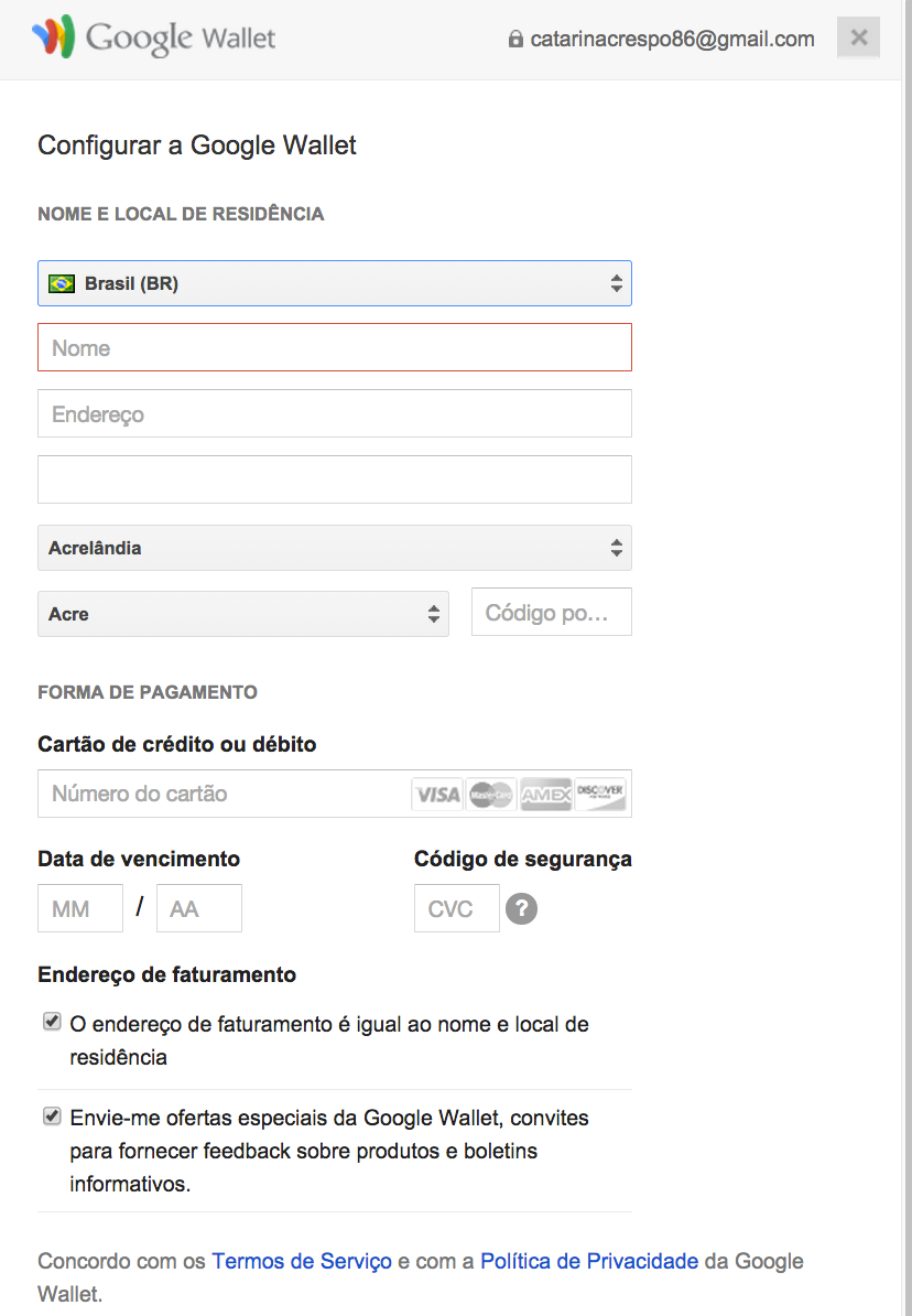 Selecione o seu país na lista e preencha o pedido relacionado com as informações pessoais para que estas informações possam ser conectadas ao cartão de pagamento que você deseja usar no processo de pagamento.