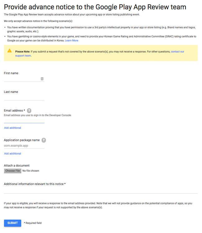 Uma vez que tenha a sua documentação escrita, deverá notificar previamente a equipa de revisão Google Play.