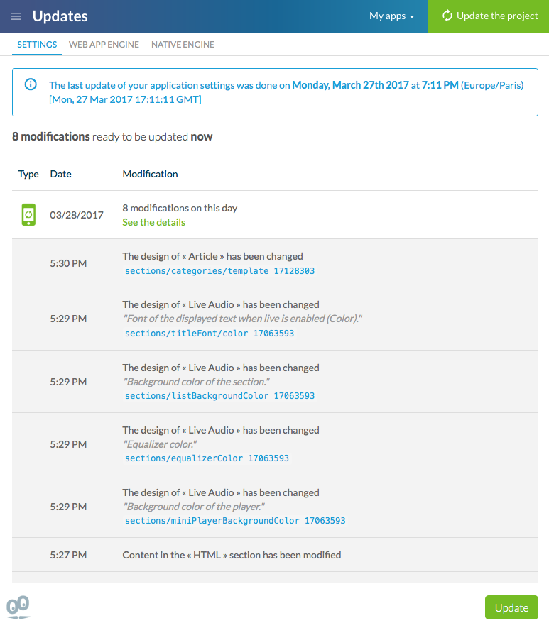 Uma vez que o seu app nativo ou web seja generado pelo menos uma vez, a larga parte das modificações apenas requer que você atualize suas configurações para que fiquem visíveis no app, tanto na versão nativa como web.