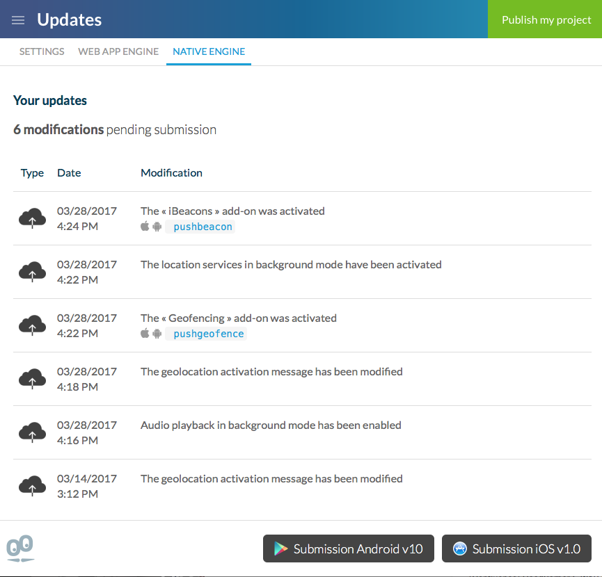Todas as modificações listadas sob Publicar > Atualizar > Atualizações > Motor Web App ou Publicar > Atualizar > Atualizações > Motor Nativo necessitam que você regenere seu app para que sejam visíveis.