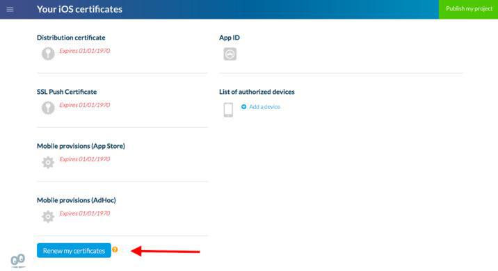 Se a versão iOS do seu app foi gerada pelo menos uma vez, você pode acessar Publicar > Certificados > iOS no seu back office HOTEL DO APP para atualizar os seus certificados Apple.