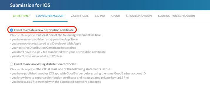 Passo 1: Selecione Quero criar um novo certificado de distribuição