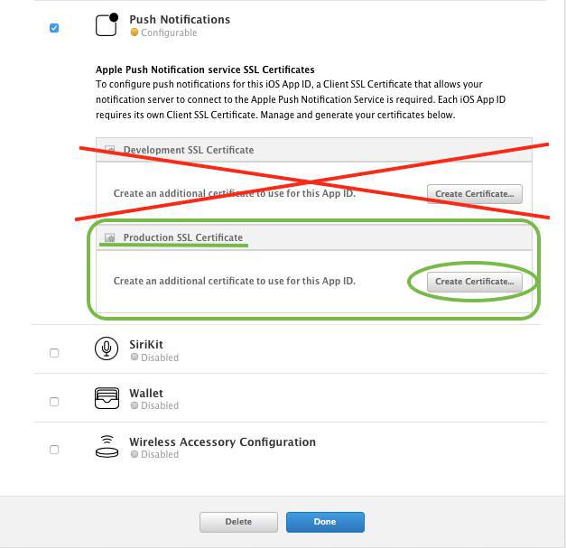Confirme que a linha Push Notifications se encontra selecionada e sob Production SSL Certificate clique em Create Certificate.