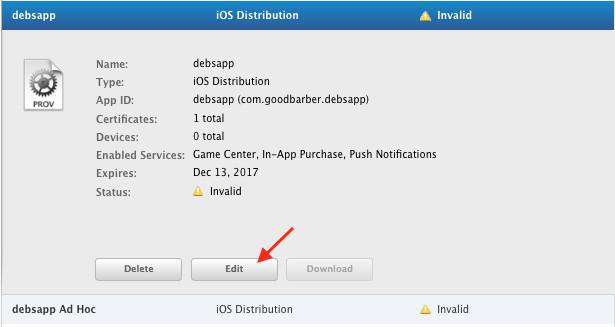 No menu Provisioning Profiles https://developer.apple.com/account/ios/profile/, selecione o seu arquivo de provisionamento atual. Esse arquivo deverá ter o mesmo nome que o seu projeto HOTEL DO APP (no exemplo que mostramos, é debsapp) e clique Edit.
