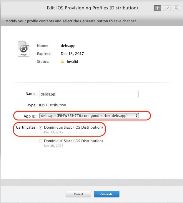 Clique em Generate e baixe o novo arquivo Mobile Provision.
