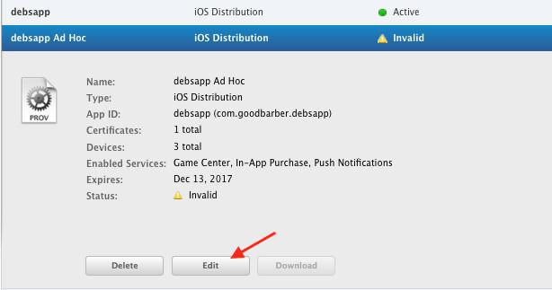 No menu Provisioning Profiles https://developer.apple.com/account/ios/profile/, selecione o seu arquivo de provisionamento existente. Deverá ter o mesmo nome que o seu projeto HOTEL DO APP seguido de ad hoc (no exemplo é debsapp ad hoc) e clique Edit.