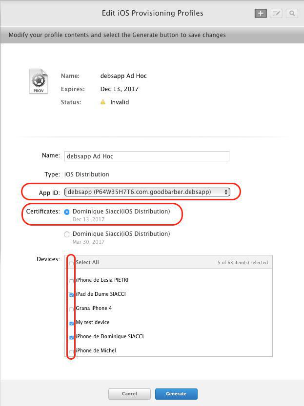 Clique em Generate e baixe o novo arquivo ad hoc mobile provision.