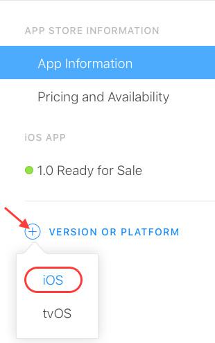 Clique no sinal "+" ao lado de VERSÃO OU PLATAFORMA e escolha iOS.