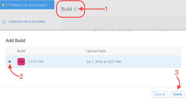Assim que o .ipa for enviado, a Apple irá requerer alguns minutos antes de o poderes adicionar à seção de "Build" no menu "Versão" do seu app.