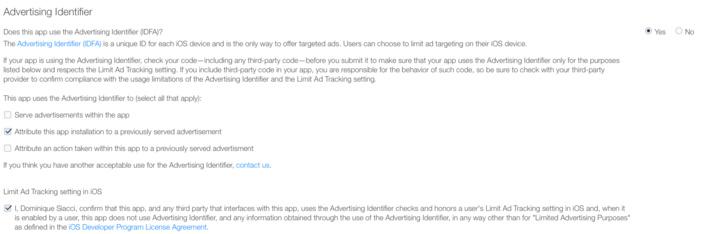 - IDFA: Responda SIM à primeira questão, selecione a opção do meio e marque a última caixa da página.