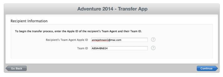 Para permitir o pedido de transferência, o destinatário Team Agent deve fornecer a sua Apple ID e Team ID para o Team Agent que inicia o processo de transferência.