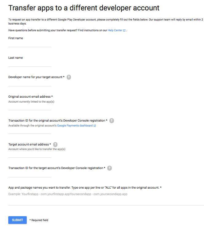 Para solicitar uma transferência de um app para uma conta de desenvolvedor do Google Play diferente, por favor preencha os campos, clicando em "enviar sua solicitação ". A equipe de suporte do Google irá responder por e-mail no prazo de 2 dias úteis.