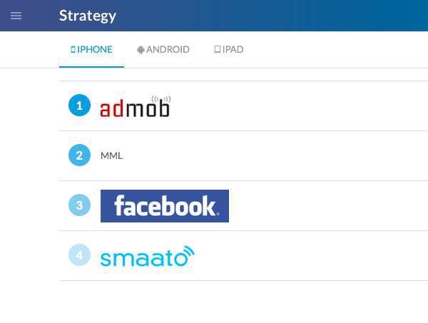 No exemplo abaixo, adMob tem prioridade. Se adMob não estiver enviando nenhum anúncio, o app irá primeiro na rede interna de anúncios ("MML") para apresentar o anúncio e finalmente ao Smaato.