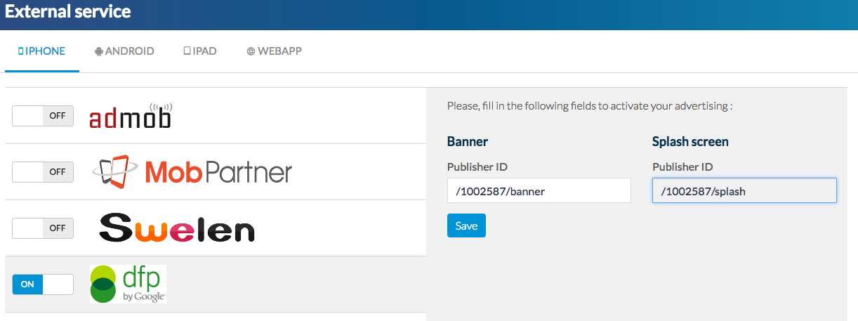 DoubleClick for Publishers (DFP) é uma plataforma completa que funciona como servidor de anúncios e facilita a sua gestão, caso desejar disponibilizar publicidade nos seus aplicativos. Os pagamentos provêem dos anunciantes ou das redes de anúncios e não diretamente da DFP.