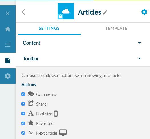 Se você deseja que seus usuários possam compartilhar o conteúdo de uma seção do seu aplicativo, certifique-se de ter ativado o primeiro ícone de compartilhamento na seção correspondente.