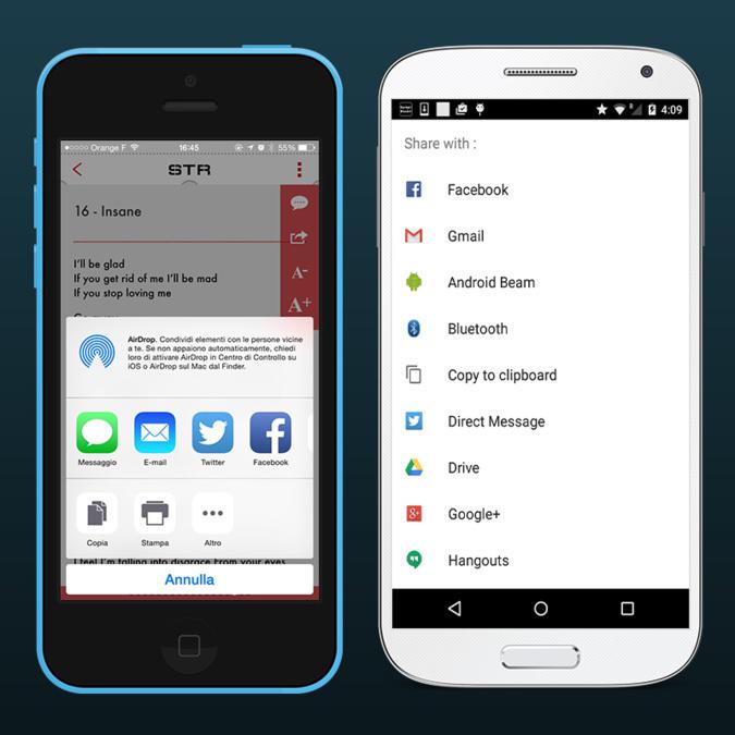 A partir da do aplicativo, quando o usuário clicar no ícone de compartilhamento em um determinado artigo, ele poderá compartilhar o link do conteúdo em um dos aplicativos sociais instalados no telefone (Facebook, Twitter, WhatsApp, SMS, etc.).
