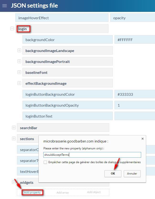 Abra o menu sob o objecto "login", e adicione a propriedade: shouldAcceptTerms.