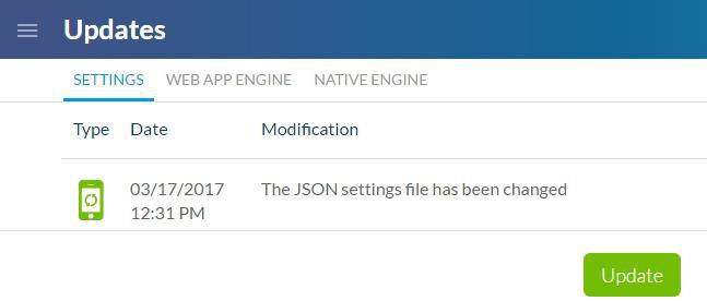 A alteração será ativada no seu aplicativo depois de clicar no botão verde Atualizar no menu Publicar > Atualizar > Atualização > Configurações do seu back office.