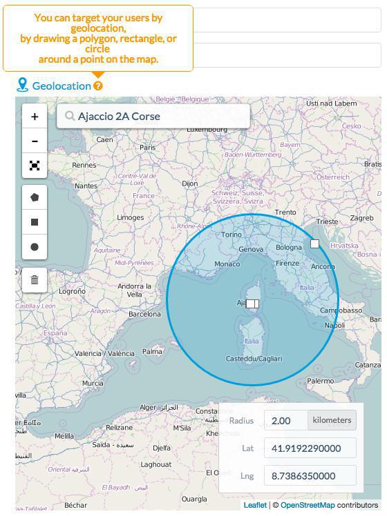 Você pode definir a zona geográfica onde a notificação será enviada desenhando um círculo, um quadrado, ou um polígono no mapa.