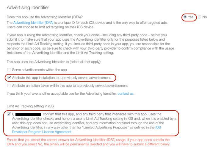 Você deve sempre responder "Yes" às perguntas: "Does this app use the advertising identifier (IDFA)?"