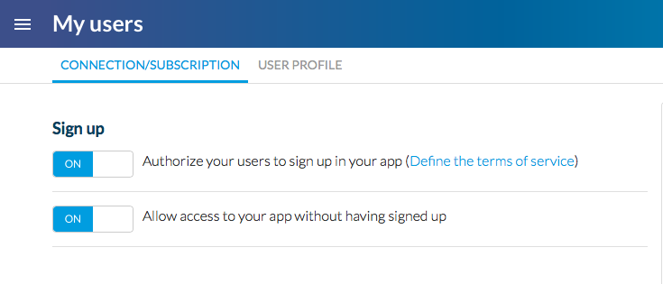 Por este motivo, se o seu aplicativo tem a função de autenticação, certifique-se que o botão "Autorize o acesso ao seu app sem ser registrado" em Usuários > Meus usuários > Configurações está ativo. Esta configuração pode ser editada após o seu aplicativo ser publicado.