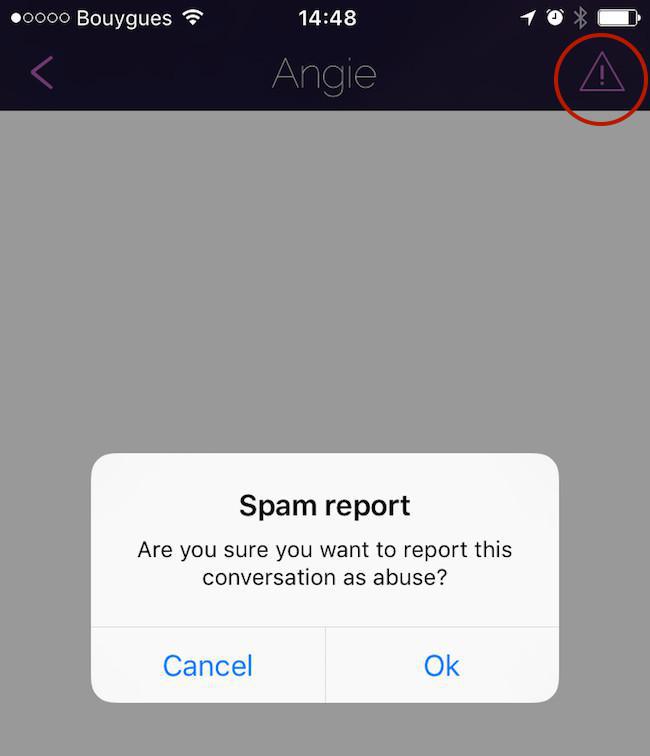 Para fazer isso, selecione um perfil de usuário na seção diretório de usuários do seu aplicativo, e faça como se estivesse enviando uma mensagem. O sinal de alerta será exibido no canto superior direito da página, clique para mostrar a mensagem de alesta, como na imagem abaixo.