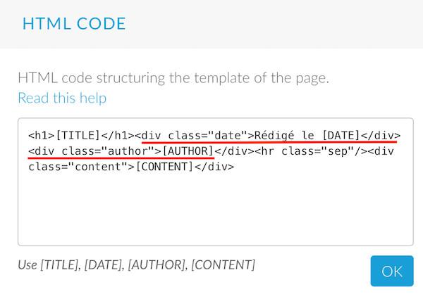 Pode tanto editar os tokens como o texto, ou se preferir, poderá remover a data e autor ao deletar a porção de código correspondente a esta informação, conforme abaixo: