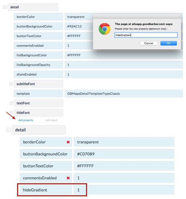 No botão da lista abaixo do ícone "detalhes", clique em "add property" (o link irá aparecer se mover o mouse por cima do botão da lista "detalhes"). Um pop-up irá aparecer, preencha o hideGradient property e valide-o.