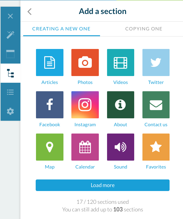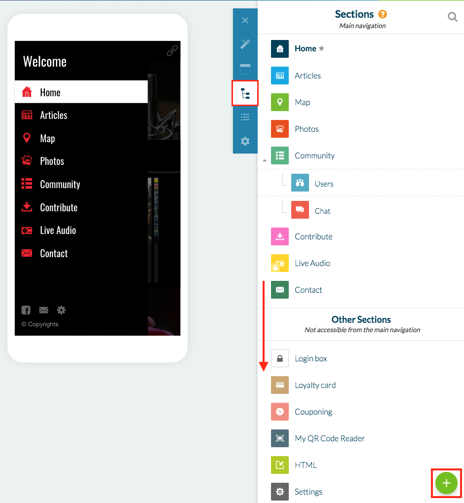 No Construtor, você pode acessar a guia Seções no menu do lado direito para gerenciar as seções de seu aplicativo clicando no botão verde + na parte inferior da página. Você também pode alterar a ordem de suas seções e adicionar / remover seções.