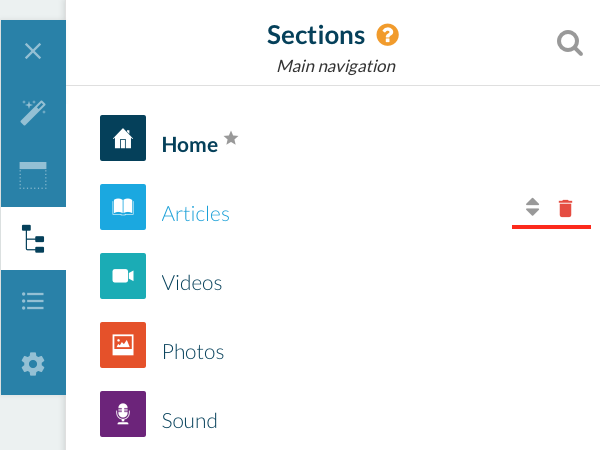 Para excluir uma seção, mova o rato sobre a seção em questão para exibir o ícone vermelho e clique nele.