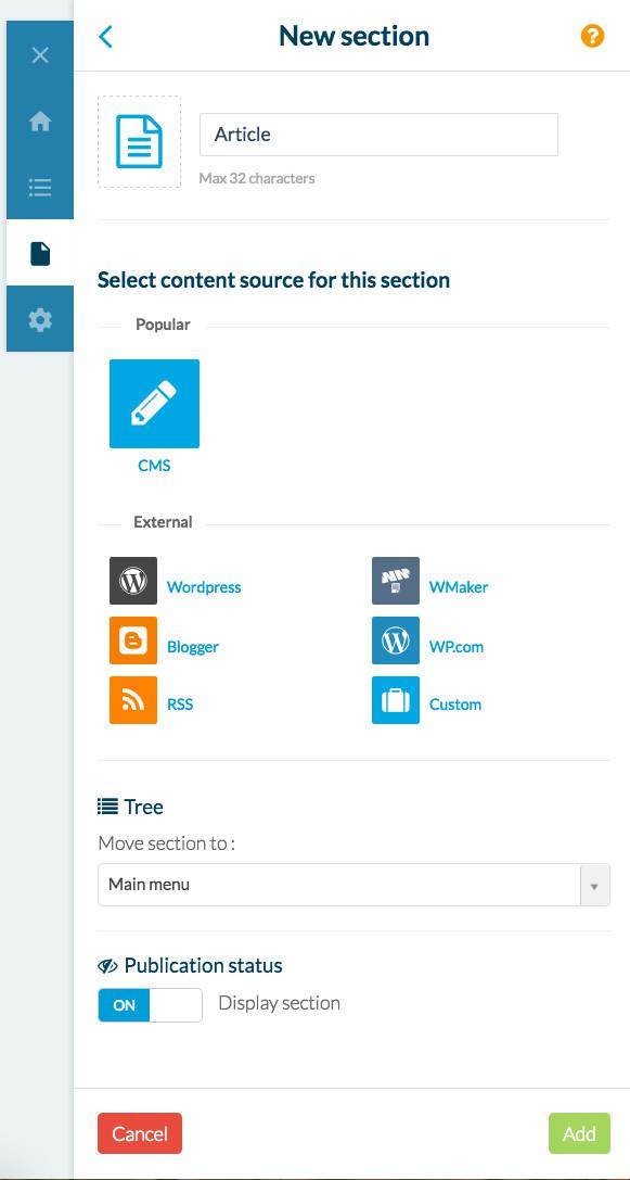 Para selecionar a seção Artigo, clique no terceiro ícone do menu no canto superior direito da tela, Seções > botão verde "+" > Clique em Artigo, selecione CMS ou fonte externa, dê-lhe um título e, em seguida, clique em em Adicionar.