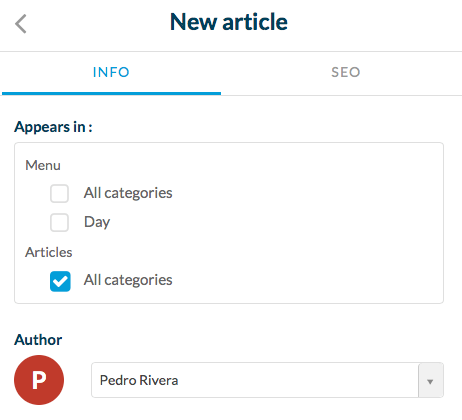 A aba Informações também permite que você escolha a categoria em que o artigo será exibido. Você pode exibi-lo em várias categorias.