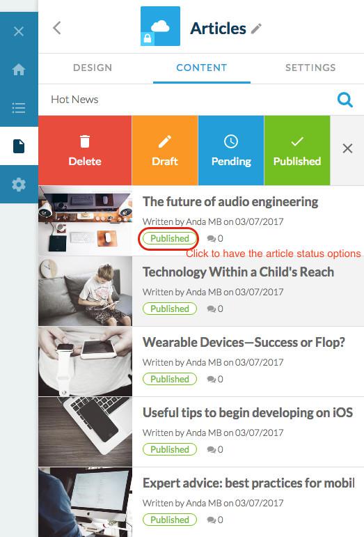 Aqui você pode adicionar ou excluir seus artigos e definir seu status de publicação: