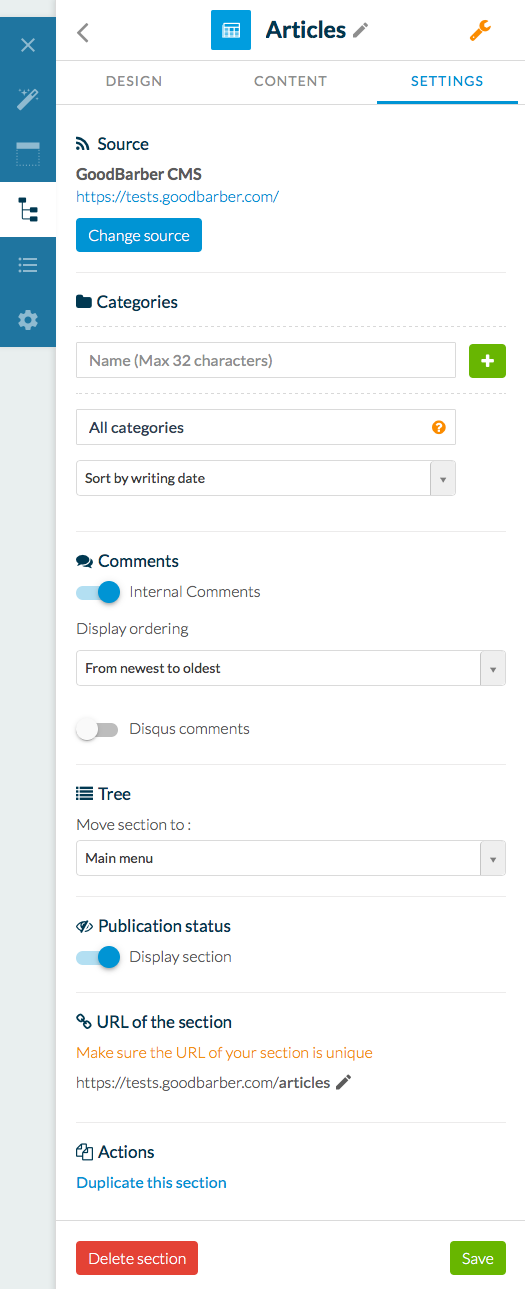 Não se esqueça de Salvar as modificações, ou se você não está satisfeito com sua seção, você pode clicar no botão Excluir seção em vermelho.
