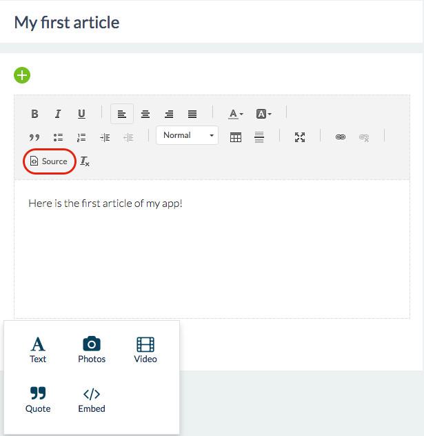 O ícone verde + nos parágrafos permite adicionar um parágrafo (de texto), uma foto, um vídeo, uma citação ou um código incorporado para vídeo.