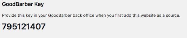 A chave GoodBarber é uma sequência de números composta que aparecem em negrito na página de configuração do plugin GoodBarber. Conseguirá facilmente identificá-la.