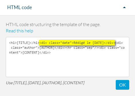 Para eliminar a data, você precisa apagar esta função no código <div class="date">Escrito em [DATE]</div> presente no menu de Código HTML, depois clique em OK.