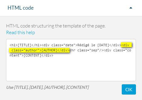 Para eliminar o autor, você precisa apagar esta função no código <div class="author">[AUTHOR]</div> presente no menu de Código HLTM, depois clique em OK.