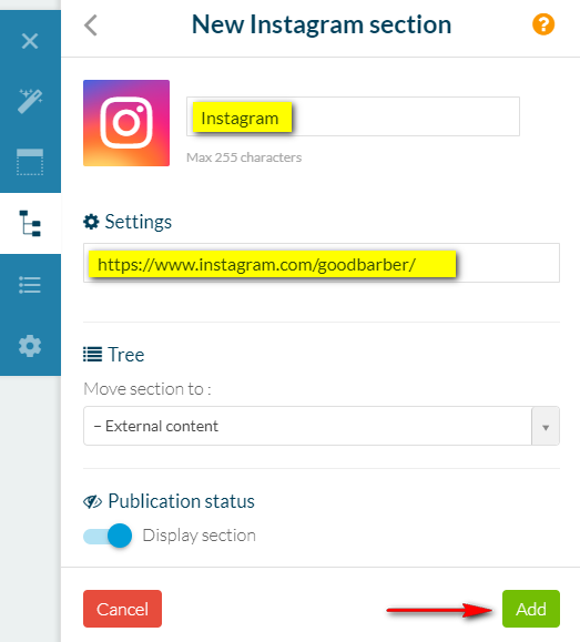 Existe a possibilidade de você conectar sua página de Instagram adicionando um link no seu Modo de Navegação (link no menu, ou tab).