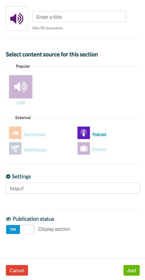 Para conectar um RSS feed iTunes ao seu app, basta inserir o URL numa seção de som.