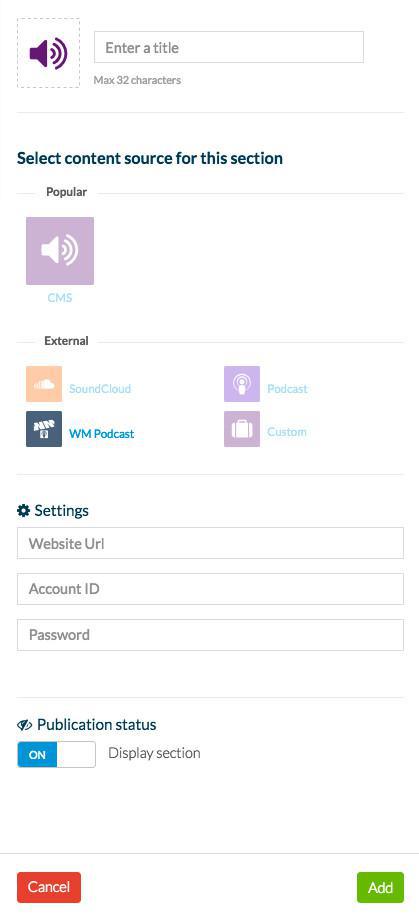 Para conectar um feed podcast WM, basta inserir o URL e a sua ID de conta.