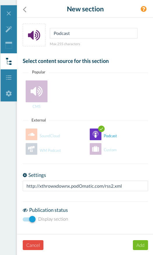 Adicione um título à sua seção e selecione o conector de podcast. Cole a URL do seu podcast e clique em Adicionar.