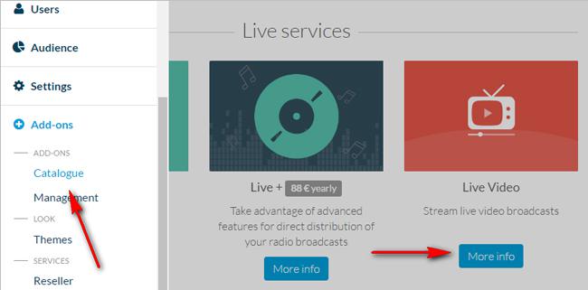 Ative o Add-On Live Video no seu menu Add-Ons > Catálogo > Serviços live.