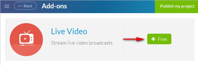 Clique no botão verde "+" para adicionar Add-On do Live Video.