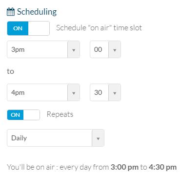 Para agendar o seu streaming, acesse a aba Configurações, ative o botão Agendamento, e insira o horário que você deseja ir ao ar.